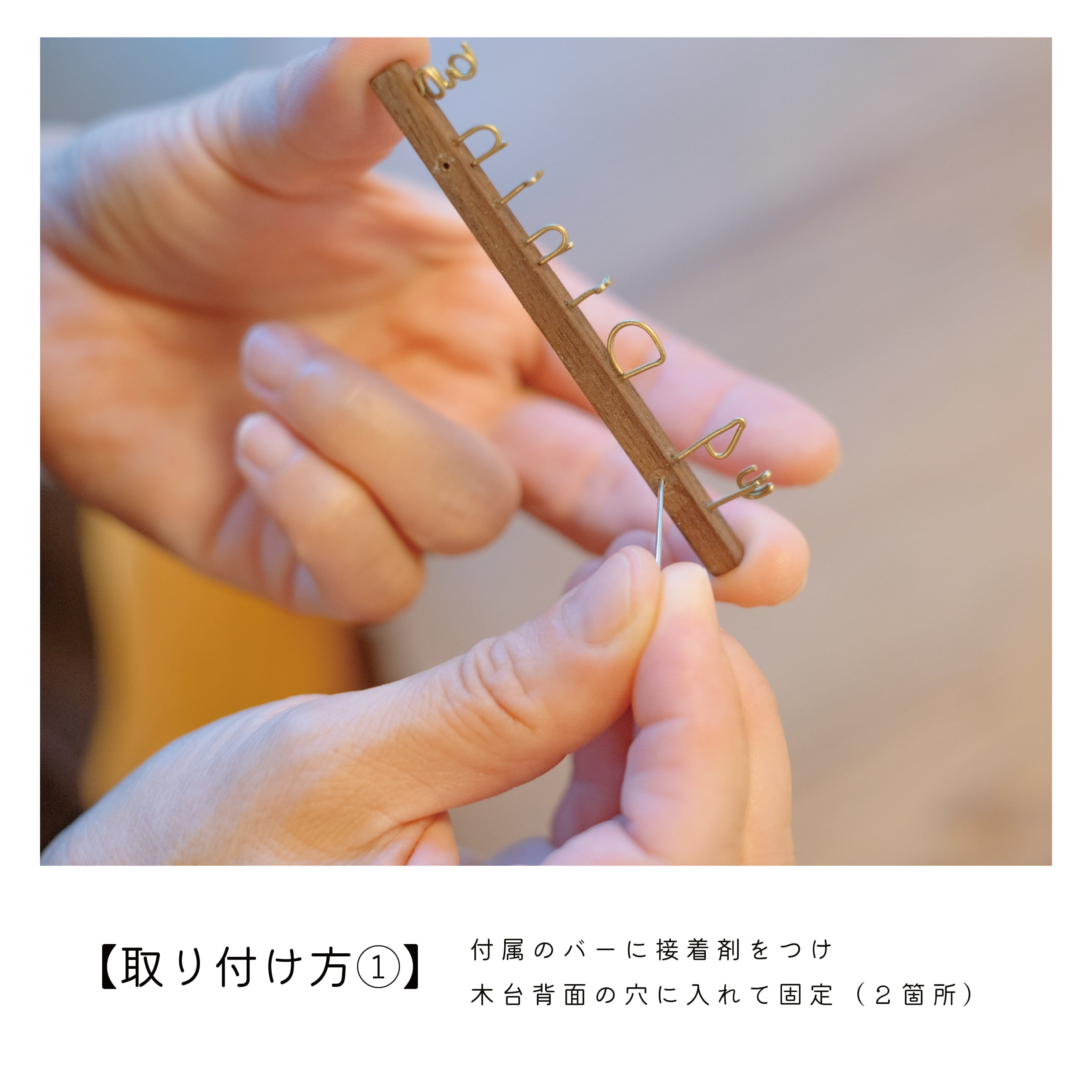 2. 付属のバーの先端に接着剤をつけ、木部の穴に差し込みます(2箇所)