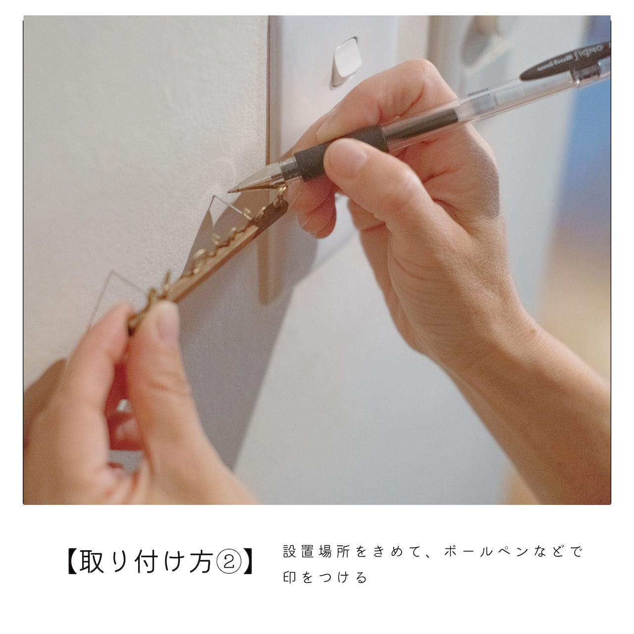 3. 壁に取り付ける位置を決め、バーの先端を当ててボールペン等で印をつけます。